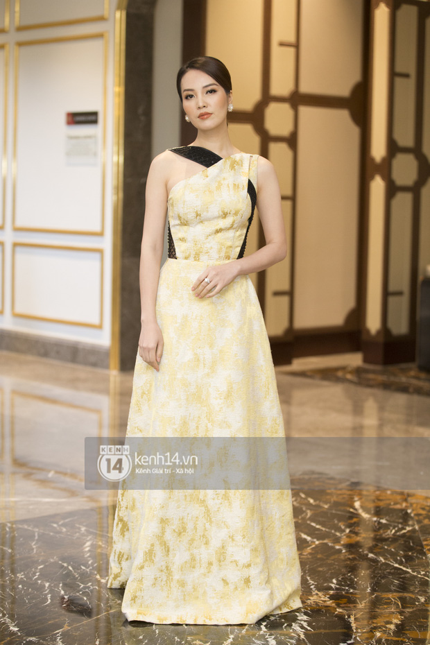 Á hậu Thuỵ Vân diện váy vàng nổi bật trong buổi họp báo, cô còn gây chú ý khi đeo nhẫn kim cương lấp lánh.
